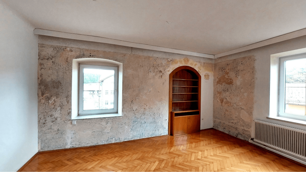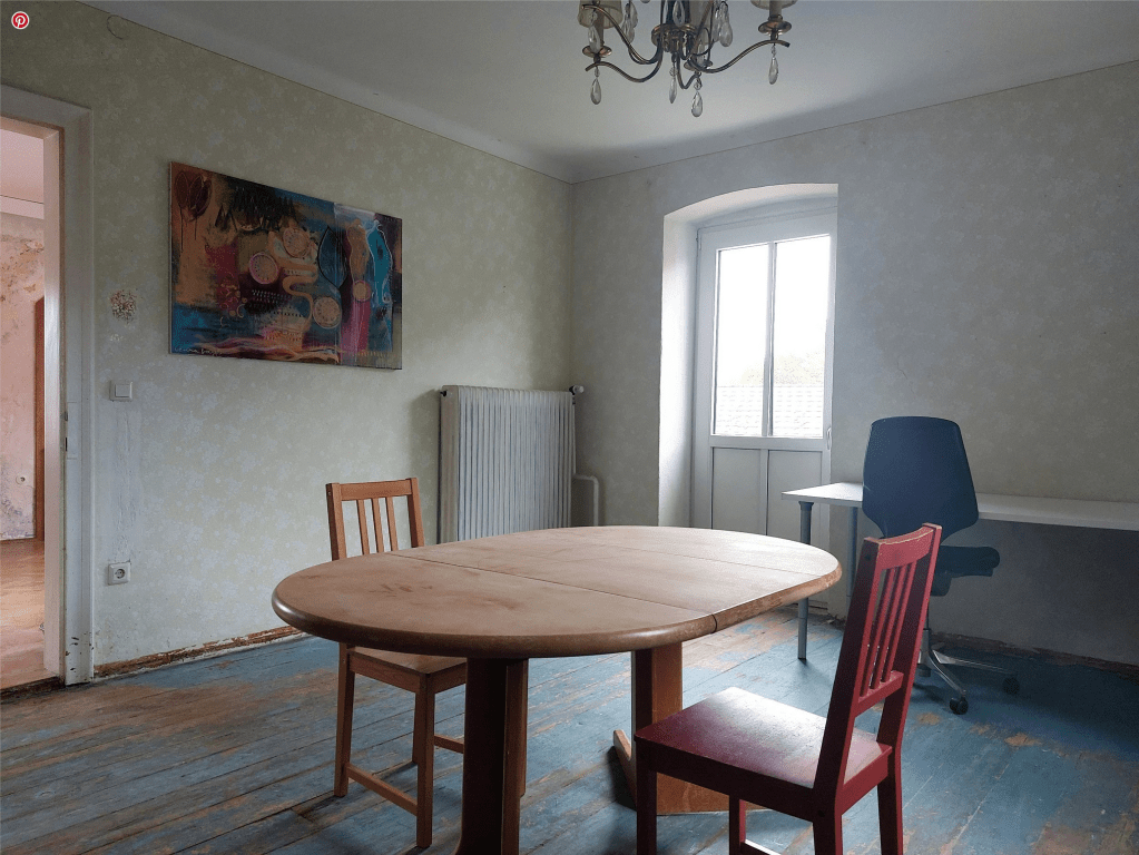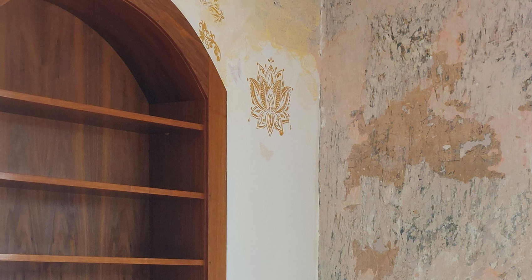 Hier waren die Wände die vorrangige Aufgabe, die gelbe Farbe war alt und schmutzig, also machten wir uns ans Streichen, dachten wir “weißeln” schnell runter. Da kamen uns gleich Schichten über Schichten von Farbe entgegen. Also mussten wir aus Zeit- und Ressourcengründen entscheiden, wie es weitergehen sollte. Da uns ein gewisser Forschergeist inne ist, wurde weiter gekratzt und es ergab sich nach und nach ein wunderschönes Wandgemälde, welches dem Raum nun eine sehr weiche und wohlige Atmosphäre verleiht und gemeinsam mit dem Fischgrätparkett einzigartig wirkt.